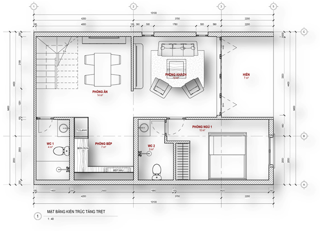 Gác lửng là giải pháp thiết kế chính, giúp tăng diện tích sử dụng trong khi vẫn đảm bảo sự thông thoáng và kết nối thị giác giữa các tầng. Nhờ đó, không gian sinh hoạt chung trở nên cao ráo, mở rộng tầm nhìn và tạo cảm giác thoải mái hơn cho người sử dụng
