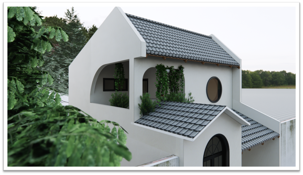 Tông màu trắng kết hợp vật liệu tự nhiên như ngói, kính và cây xanh mang đến cảm giác nhẹ nhàng, sạch sẽ và thư giãn. Hệ cửa kính mở rộng tối đa ánh sáng tự nhiên vào nhà, đồng thời kết nối bên trong với cảnh quan bên ngoài một cách hài hòa.