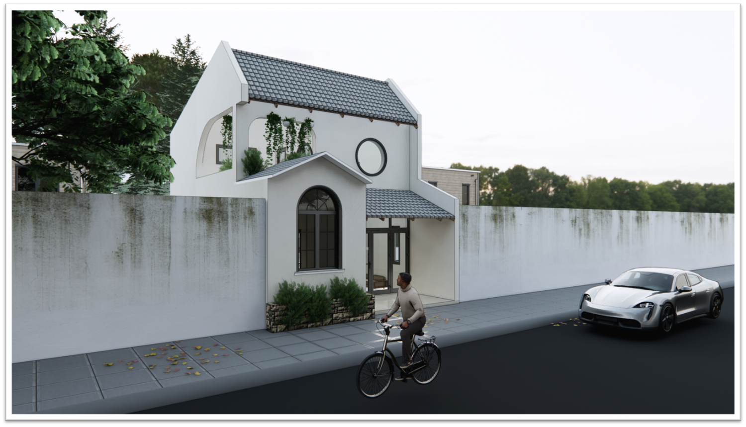 Ngôi nhà gác lửng này được thiết kế với định hướng tối giản nhưng vẫn đầy cá tính. Kiến trúc sư lựa chọn mái ngói dốc truyền thống kết hợp với các đường nét hiện đại như cửa kính lớn, ô cửa tròn và vòm cong mềm mại, tạo nên một mặt tiền vừa lạ mắt vừa thân thuộc.