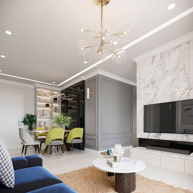 Ấn tượng ngay từ ánh nhìn đầu tiên với gam màu trung tính kết hợp điểm nhấn vàng ánh kim. Bộ ghế sofa xanh navy lịch lãm, bàn trà mặt đá tinh xảo, mảng tường ốp đá vân mây cùng hệ đèn trần nghệ thuật giúp không gian trở nên sang trọng và cuốn hút. Đây là nơi lý tưởng để cả gia đình quây quần, tiếp đón khách quý trong không khí ấm cúng nhưng vẫn rất “chất”.