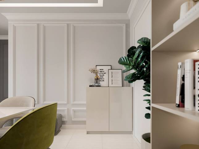 Bàn ăn với ghế bọc nhung xanh olive tạo điểm nhấn cá tính. Hệ tủ kệ âm tường, đèn trang trí dạng vòng tròn mềm mại vừa cung cấp ánh sáng vừa tăng tính thẩm mỹ. Mọi chi tiết được tính toán để tối ưu diện tích, mang lại cảm giác gọn gàng và sang trọng.