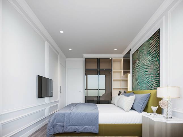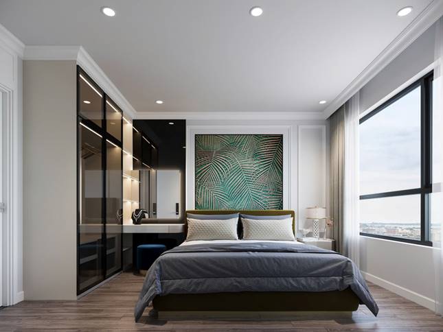 Không gian phòng ngủ hiện đại với mảng tường đầu giường họa tiết lá tropical xanh mát, cửa sổ lớn đón ánh sáng tự nhiên, kết hợp hệ tủ kính đen bóng cao cấp. Khu vực bàn trang điểm/ bàn làm việc nhỏ gọn giúp tối ưu công năng. Đây chính là “ốc đảo riêng” để bạn thư giãn và tận hưởng sự bình yên sau một ngày dài.