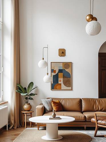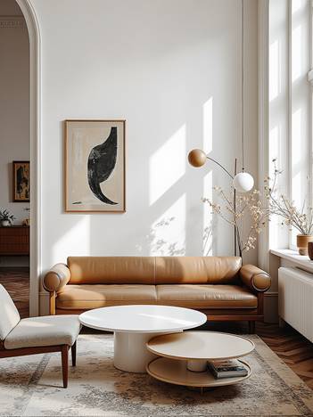 - Sofa da cao cấp gam màu caramel hoặc kem sáng, kết hợp gối trang trí nhã nhặn.
